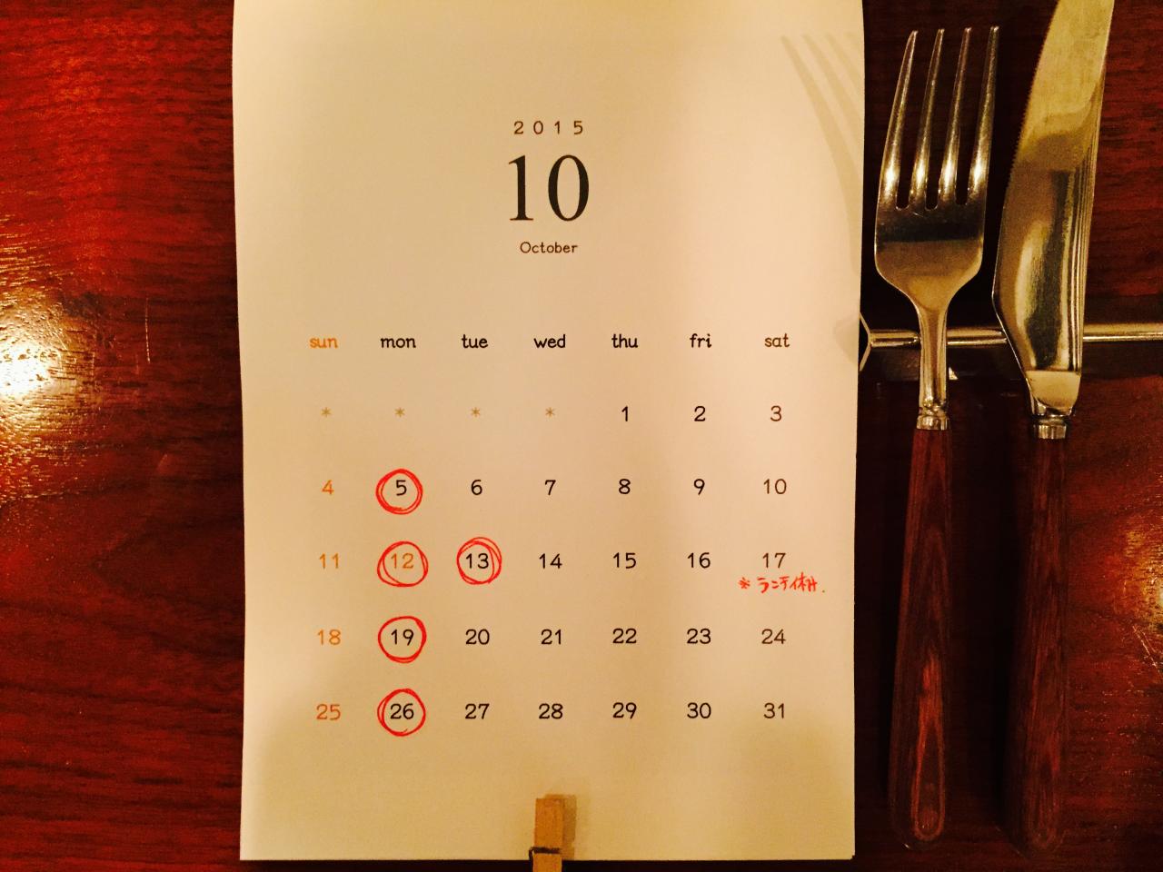 たいへん遅くなりましたが、10月は毎週 月曜日に加え、13日 火曜日と17日 土曜日のランチ営業のみ、お休みをいただきます。